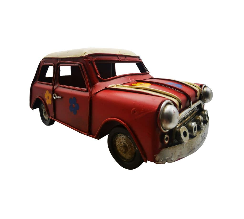 Unique Red Vintage Car Model with Metal and Floral Accents – Decorative Collectible for Nostalgic Car Lovers