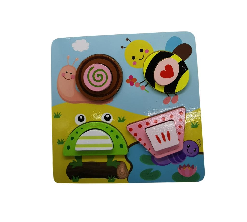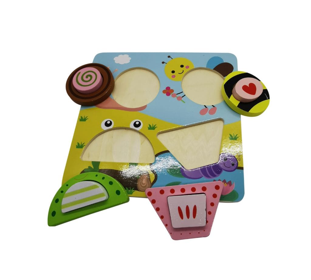 Original price was: AED35.00.AED15.00Current price is: AED15.00.Wooden Garden Friends Puzzle Board for Kids – Educational Shape Sorter Toy Featuring Snail, Bee, Frog, and Teacup Characters for Early Learning and Development